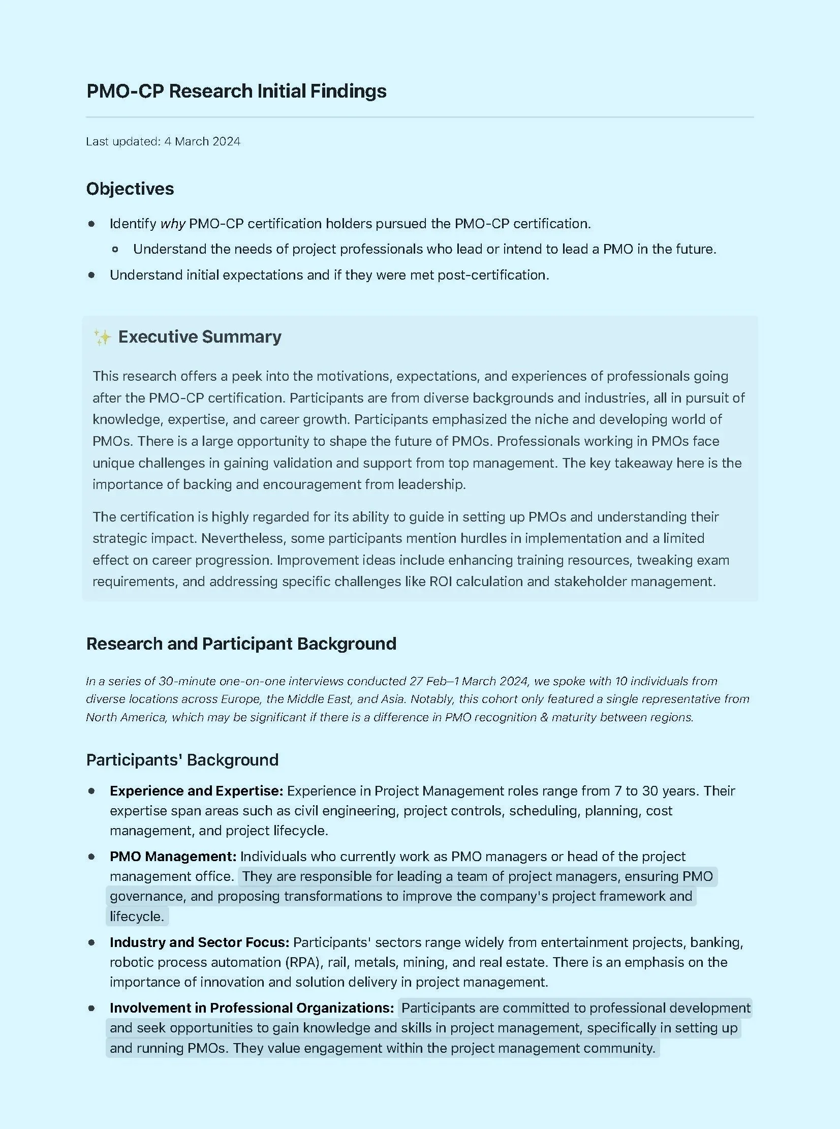 We conducted in-depth qualitative research through ten 30-minute interviews with PMO-CP certification holders across Europe, the Middle East, and Asia. Participants represented diverse industries including banking, engineering, software, and real estate, with 7-30 years of professional experience., and included current PMO managers and senior leaders responsible for governance and project lifecycle management. This provided comprehensive insights into how the certification affects real-world practice.