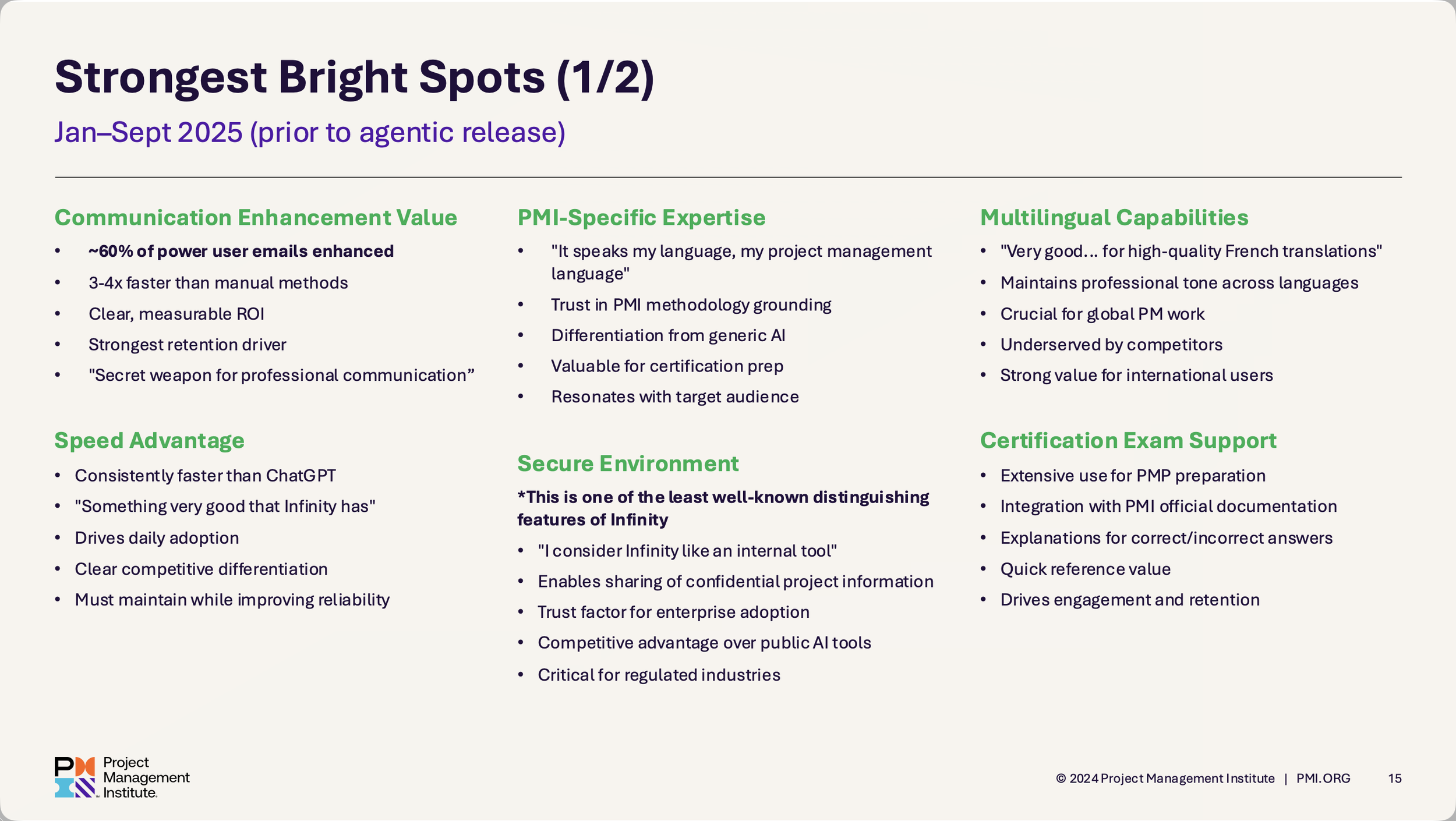 The Jan–Sept synthesis—compiled from ten studies and three global field events (150+ participants)—gave the team a comprehensive picture of the pre-agentic user experience. It included both the platform’s strongest assets (communication enhancement, PMI expertise, speed) and its most critical gaps (generic outputs, insufficient context-gathering, lack of visual outputs, missing integrations) — findings that fed directly into the agentic roadmap. I also identified eight cross-cutting themes, including: